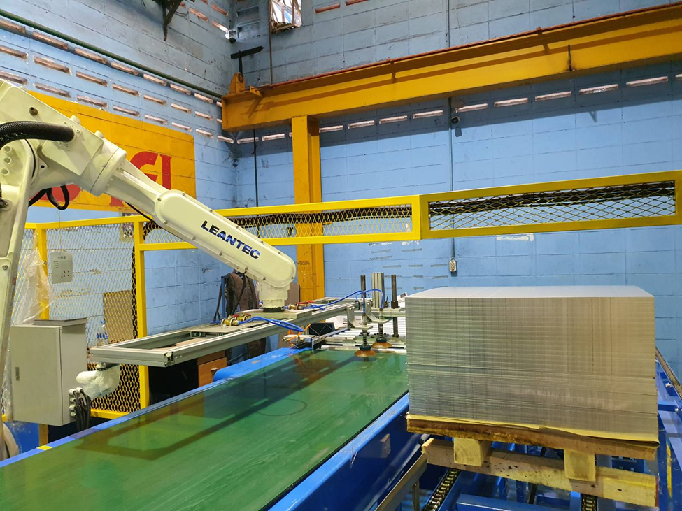 In response to this challenge, the Syntec x Leantec Thailand branch utilized the Leantec LRA-1717 Six-joint Robotic Arm equipped with sensors and peripheral feeding devices. This series of arms can easily pick up and place approximately 3.0 kg of sheet material in just 3 seconds, equivalent to the capability of four operators and can operate continuously throughout the day. This doubles processing efficiency and, more importantly, creates a safer and more friendly working environment.